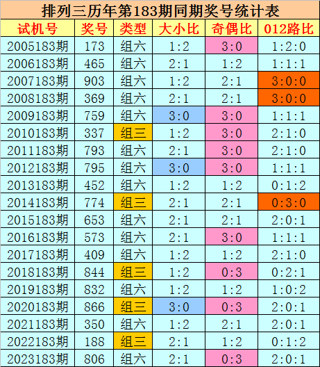 组选类型推荐:历史上排列三第183期同期奖号中,组六出现14期,组三出现5次,今年第183期预计奖号为组六号码。