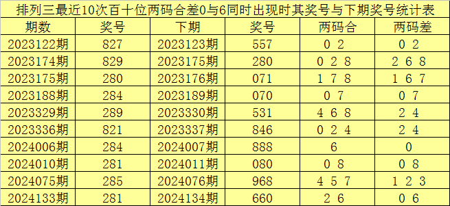 百十位合差分析:上期奖号百十位开出28组合,两码合为0,两码差为6,最近10次百十位两码合0与两码差6同时出现时,其奖号和下期奖号分别为: