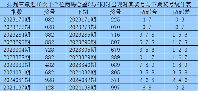 从以上统计可以看出,十个位两码合差0与6同时出现之后其下期两码合差表现最热的4个分别为:3678,本期十个位两码合差可以参考这四码中的数据。