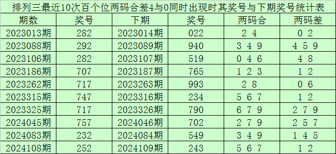 百个位合差分析:上期奖号百个位开出22组合,两码合为4,两码差为0,最近10次百个位两码合4与两码差0同时出现时,其奖号和下期奖号分别为: