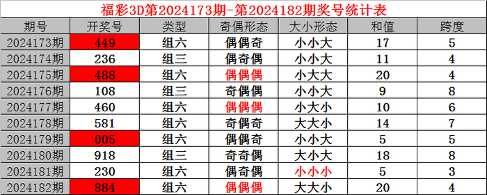 上期回顾:福利彩票3D第2024182期开奖结果884。奖号:偶偶偶、大大小,和值20,跨度4。