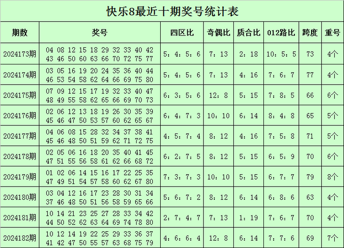 福彩快乐8第2024182期开奖回顾:10 12 14 19 22 25 29 33 36 37 41 42 47 50 55 57 63 68 75 79,其中奖号四区比为4:6:6:4,奇偶比为12:8,质合比为6:14,跨度为69,012路比为7:7:6,开出7个重号:10、14、25、33、42、50、63。
