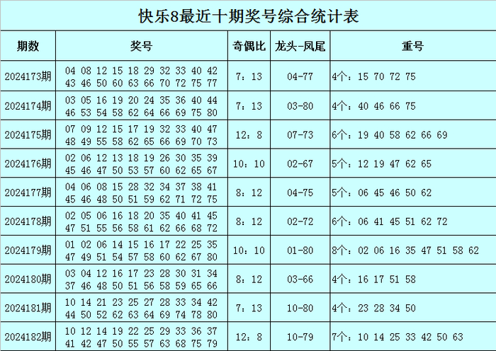 福彩快乐8第2024182期开出奖号:10 12 14 19 22 25 29 33 36 37 41 42 47 50 55 57 63 68 75 79,其中奖号奇偶比为12:8,出现7个重号10、14、25、33、42、50、63,开出连码36 37、41 42。
