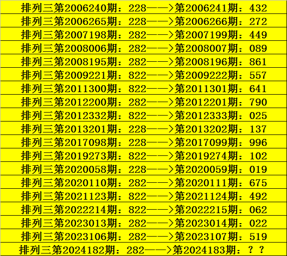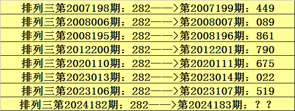 第2024182期排列三奖号为282,历史上该号码直选出现8次,下期奖号分别为:449、089、861、790、675、022、519。