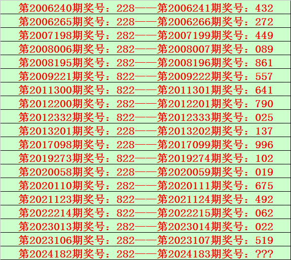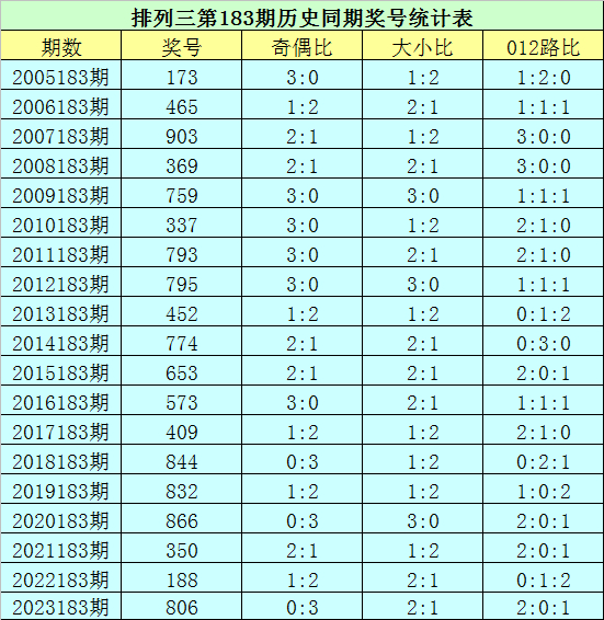 排列三第2024183期开奖日期:2024年7月11日,历史上第183期已开出了19次奖号,历年同期号码分别为:173、465、903、369、759、337、793、795、452、774、653、573、409、844、832、866、350、188、806。