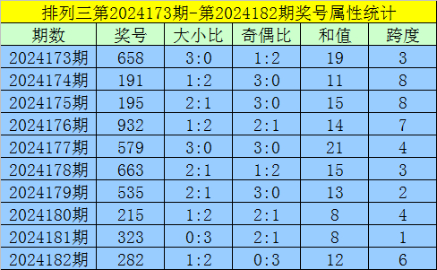 上期回顾:排列三第2024182期出现奖号282。开出组三,奇偶比0:3,012路比0:0:3,大小比1:2,和值12,跨度6。