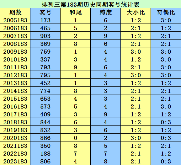 历年第183期排列三同期奖号开出:173、465、903、369、759、337、793、795、452、774、653、573、409、844、832、866、350、188、806。