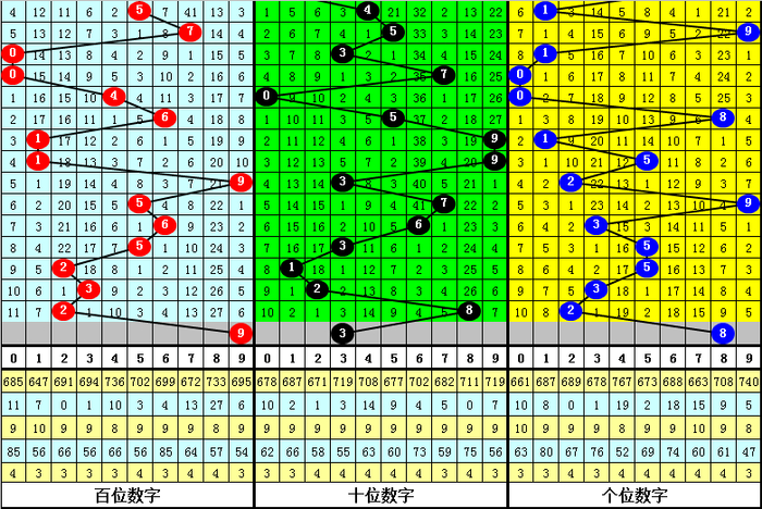跨度分析:在排列三第183期历史同期中,奖号跨度大小比为9:10,012路比为9:6:4,奇偶比为7:12,跨度出现期数为:跨度4→5期,跨度6→4期,跨度3→3期,跨度2、9→2期,跨度5、7、8→1期,跨度0、1→0期,本期预计开出大跨度,精选跨度6。