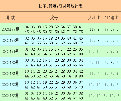 快乐8第2024183期奖号为:01 07 10 14 16 21 30 35 37 38 41 45 47 49 52 57 58 64 67 69,其中奖号012路比为5:10:5,大小比为10:10。