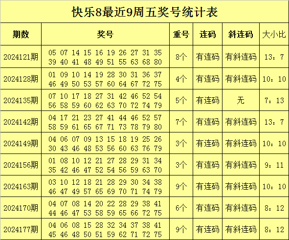 安仔最近9周五快乐8奖号分析
