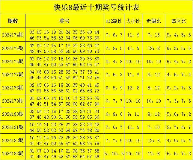 福彩快乐8第2024183期开奖回顾:01 07 10 14 16 21 30 35 37 38 41 45 47 49 52 57 58 64 67 69,其中奖号012路比为5:10:5,和值为758,跨度为68,奇偶比为12:8。