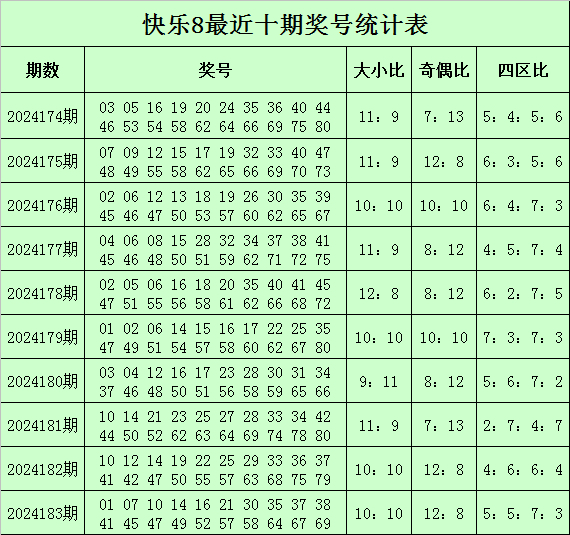 福彩快乐8第2024183期开奖回顾:01 07 10 14 16 21 30 35 37 38 41 45 47 49 52 57 58 64 67 69,其中奖号四区比为5:5:7:3,奇偶比为12:8,大小比为10:10。