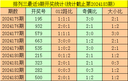 一、排列三第2024183期开出号码500,其奇偶比为1:2,大小比为1:2,号码012路比为2:0:1。该号码直选历史上出现了9次。