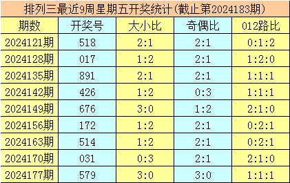 三、体彩排列三前9周星期五奖号分别开出:518-017-891-426-676-172-514-031-579,其中号码012路比为8:12:7,奇偶比为16:11,大小比为14:13;