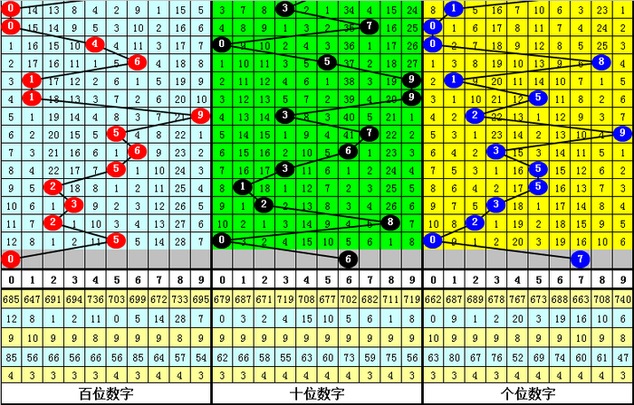 上期第二位奖号为:0,间隔10期之后开出,走势较温,前10期该位热码开出次数较少,本期注意该位热码逐渐回暖,关注号码6。