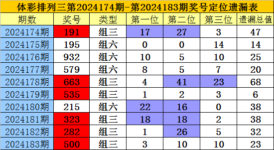 开奖回顾:排列三第2024183期奖号为:500,各位号码遗漏值分别为3、10、10,遗漏总值为23。