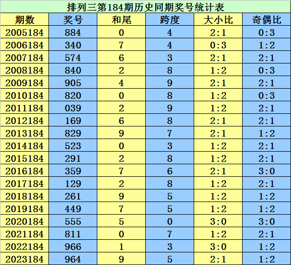 从2004年至今排列三已开出6955期奖号了,本期为排列三2024年第184期开奖,历史同期已出现19次奖号: