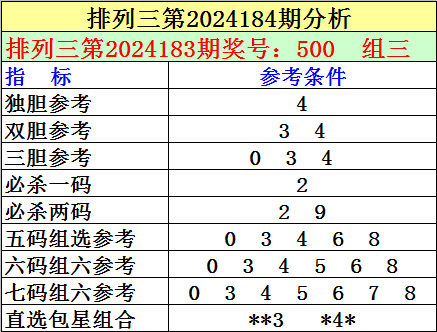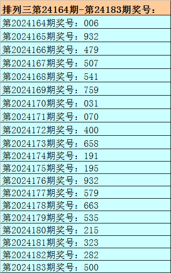 开奖回顾:排列三第2024183期开出奖号:500。其中奖号大小比为1:2,奇偶比为1:2,012路比为2:0:1,和值为5,跨度为5。