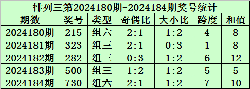 上期回顾:排列三第2024184期开奖号码为730。奖号类型为组六,奇偶比为2:1,大小比为1:2,跨度为7,和值为10。