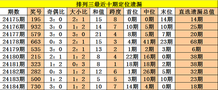 开奖回顾:排列三第2024184期奖号:730,定位直选遗漏值14期、4期、0期,遗漏总值为18期。