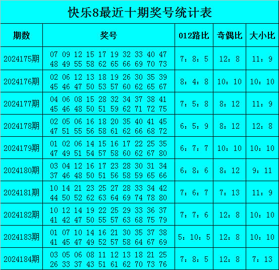 福彩快乐8第2024184期开奖回顾:03 05 06 08 11 12 13 18 21 25 26 33 37 43 51 61 62 70 73 76,其中奖号012路比为7:8:5,1路号码表现活跃。