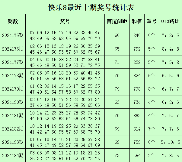福彩快乐8第2024184期开奖回顾:03 05 06 08 11 12 13 18 21 25 26 33 37 43 51 61 62 70 73 76,其中奖号首尾间距为73,和值为654,012路比为7:8:5,包含6组同尾号码:11-21-51-61、12-62、03-13-33-43-73、05-25、06-26-76、08-18,开出2个重号:21、37。