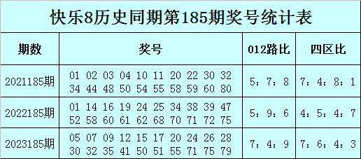 第四区【61-80】分析:在第185期历史同期开奖中,该区开出了11个奖号,总体走势较冷,去年同期该区出现3个奖号,走势较冷,今年第185期看好该区连续走冷,参考2个号码,关注72 79。