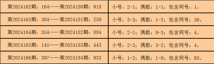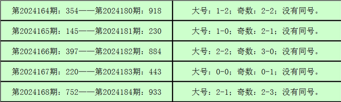 则,3D第2024169期开出奖号:402,其大小比为0:3,奇偶比为0:3,012路比为1:1:1,与3D第2024185期奖号可能没有同号。