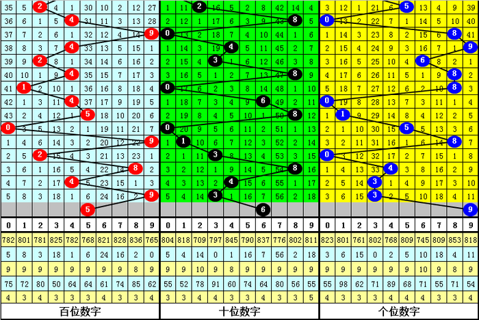 百位分析:上期百位开出奖号:9,最近9期该位奖号大小比为4:5,其中大号9出现2次,5、8出现1次,6、7出现0次,小 号4出现2次,0、1、2出现1次,3出现0次,本期百位参考大号,胆码关注5。