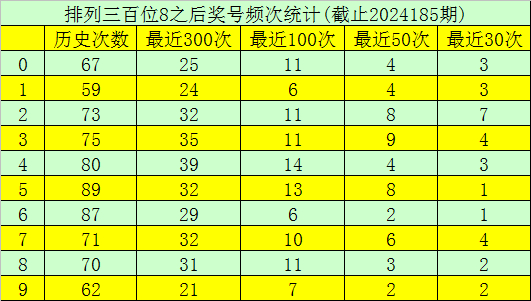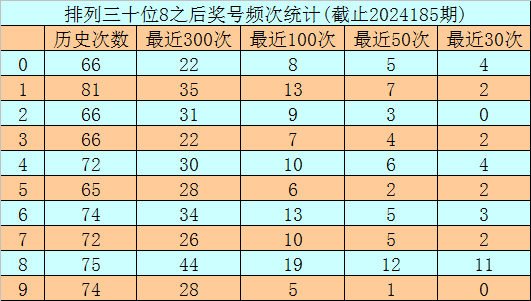 第一位杀号:上期第一位奖号为8,第一位奖号8历史上出现734次,前100次该位开出奖号8之后,下期号码0-9出现次数从高到底分别为:号码4→14次,5→13次,0、2、3、8→11次,7→10次,9→7次,1、6→6次。