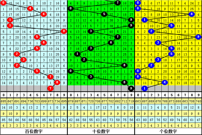 第三位杀号:第三位上期出现奖号4,该位历史上奖号4已开出了768次,最近100次第三位开出4时,下期号码0-9分别落号:号码5→15次,8→14次,0→13次,4、6→11次,1、7→9次,9→8次,2、3→5次。
