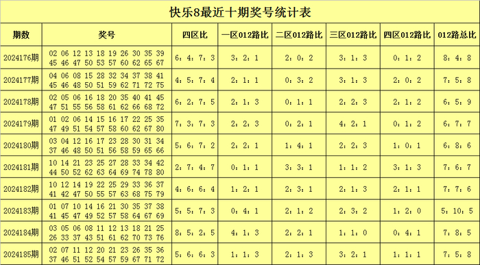 福彩快乐8第2024185期开奖回顾:02 07 11 12 20 21 23 26 35 36 37 46 51 52 54 57 59 67 71 72,其中奖号四区比为5:6:6:3,012路比为7:5:8,和值为759,跨度为70。