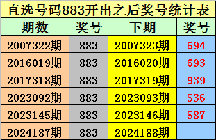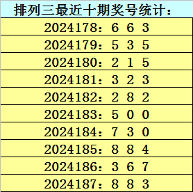 上期回顾:排列三第2024187期开奖号码为883,历史上组选出现17次,直选出现6次。