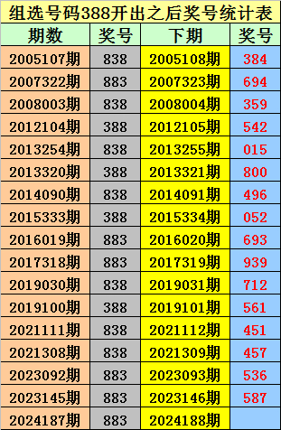排列三组选388出现之后下期分别开出:384、694、359、542、015、800、496、052、693、939、712、561、451、457、536、587。