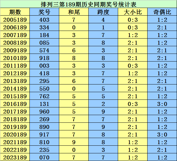 历年第189期排列三同期奖号开出:403、334、184、085、574、918、003、418、295、550、762、131、960、269、890、917、810、235、070。