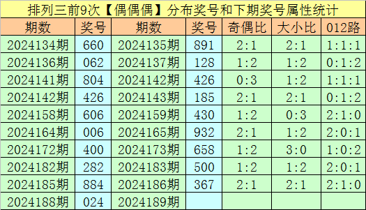 上期回顾:排列三第2024188期开出奖号024,类型为:偶偶偶、021路和小小小。