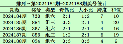 上期回顾:排列三第2024188期开奖号码为024。奖号类型为组六,奇偶比为0:3,大小比为0:3,跨度为4,和值为6。