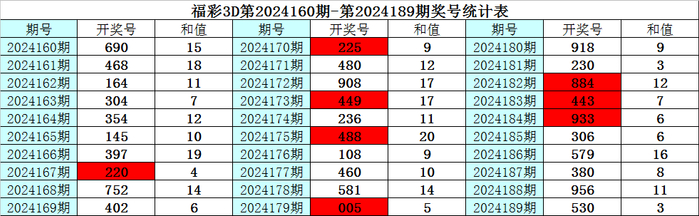 上期回顾:福彩3D第2024189期奖号为:530,其中奖号组选类型为:组六,奇偶比为2:1,大小比为1:2,012路比为2:0:1,和值为8,跨度为5。