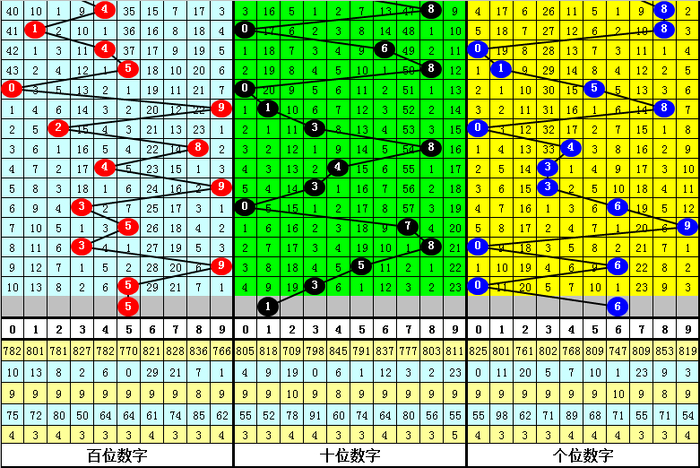 百位分析:最近7期百位分别开出奖号:4、9、3、5、3、9、5,百位振幅为6个点位,本期适当关注该位开出重复号码。