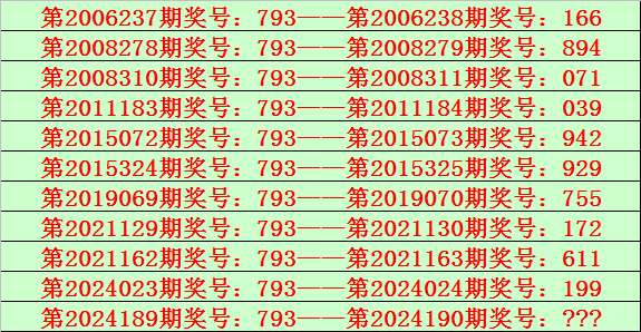 排列三第2024189期开出奖号793,该号码直选类型历史上出现了11次,前10次开出之后期下期奖号为:166、894、071、039、942、929、755、172、611、199,见下表: