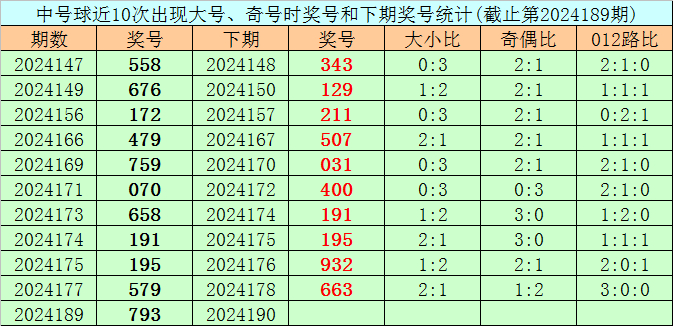 在中号球前10次开出大号、奇号类型之后,其下期分别开出奖号:343、129、211、507、031、400、191、195、932、663,其中号码大小比为3:7,012路比为7:2:1,奇偶比为5:5。