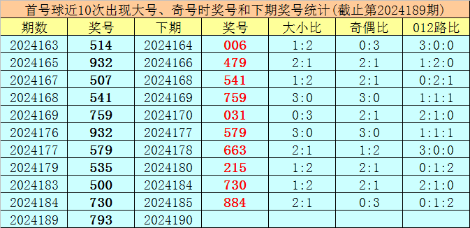 在首号球前10次开出大号、奇号类型之后,其下期分别开出奖号:006、479、541、759、031、579、663、215、730、884,其中号码012路比为3:3:4,奇偶比为4:6,大小比为6:4。