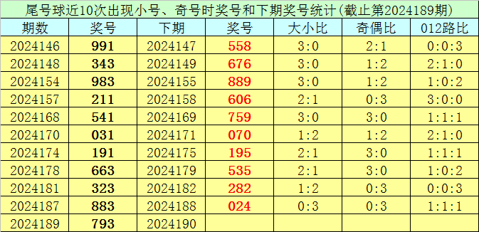 在尾号球前10次开出小 号、奇号类型之后,其下期分别开出奖号:558、676、889、606、759、070、195、535、282、024,其中号码大小比为7:3,012路比为5:1:4,奇偶比为4:6。