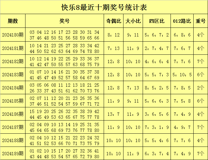 福彩快乐8第2024189期开奖回顾:01 02 10 15 17 20 27 32 36 41 43 44 48 53 54 57 65 72 79 80,其中奖号奇偶比为10:10,大小比为11:9,四区比为6:3:7:4,012路比为7:4:9,重号7个:02、10、15、32、41、53、79。