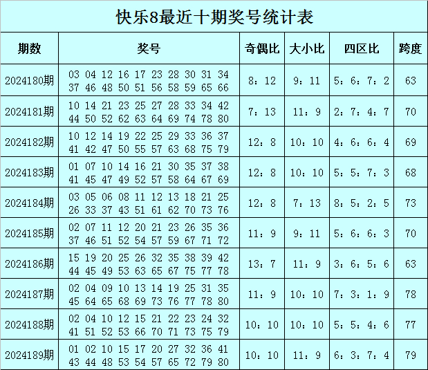 福彩快乐8第2024189期开奖回顾:01 02 10 15 17 20 27 32 36 41 43 44 48 53 54 57 65 72 79 80,其中奖号奇偶比开出10:10,大小比开出11:9,四区比开出6:3:7:4,跨度开出79。