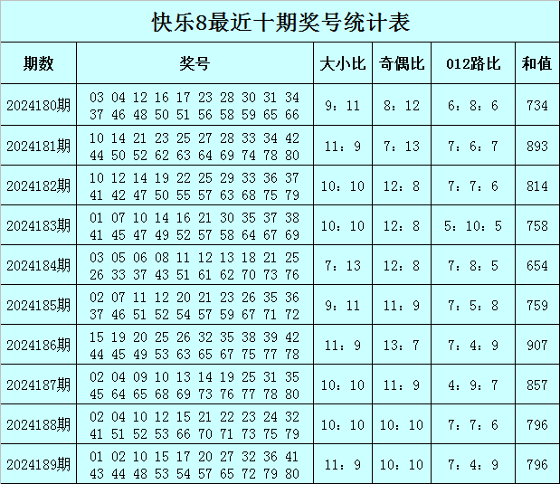 福彩快乐8第2024189期开奖回顾:01 02 10 15 17 20 27 32 36 41 43 44 48 53 54 57 65 72 79 80,其中奖号奇偶比开出10:10,大小比开出11:9,012路比开出7:4:9,和值为796,跨度为79。