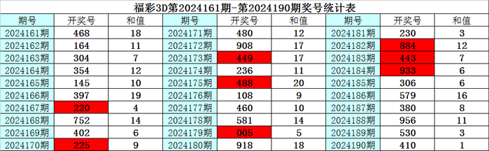 上期回顾:福彩3D第2024190期奖号为:410,其中奖号组选类型为:组六,奇偶比为1:2,大小比为0:3,012路比为1:2:0,和值为5,跨度为4。
