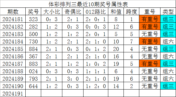 体彩排列三最近10期分别开出奖号:323、282、500、730、884、367、883、024、793、644,各奖号属性详见下表: