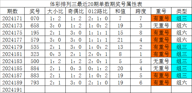体彩排列三最近20期单数期奖号分别为:070、658、195、579、535、323、500、884、883、793,各期奖号详细属性下表:
