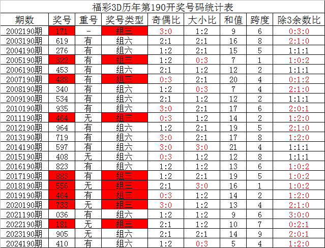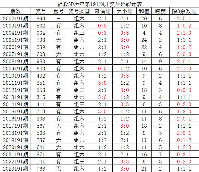 其中,组三号码开出3次,组六号码出现19次,上期奖号为组六号码,本期预计继续开出组六号码。